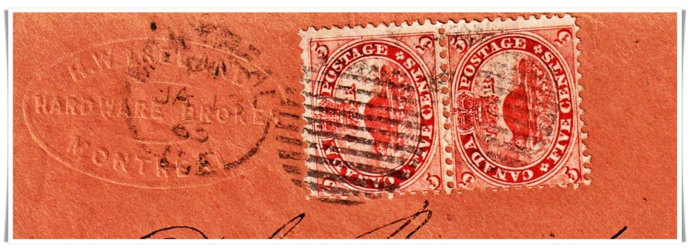 341 C o/CVR 15 vertical pair, on H.W. IRELAND HARDWARE BROKERS MONTREAL embossed advertising,