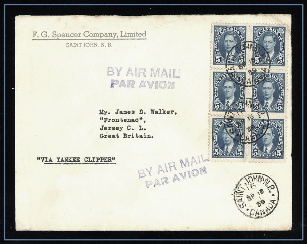 28 P o/CVR 235 (Bl of 6) ST JOHN NB 16/SP 16/39 CANADA 'VIA YANKEE CLIPPER' By AirMail to