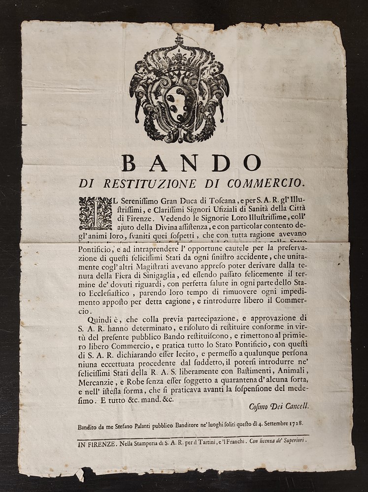 32 S o/DOC 1728 Italian Business Announcement "BANDO DI RESTITUZIONE DI COMMERCIO" Stefano