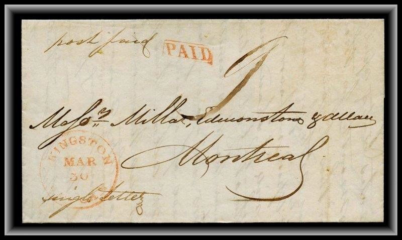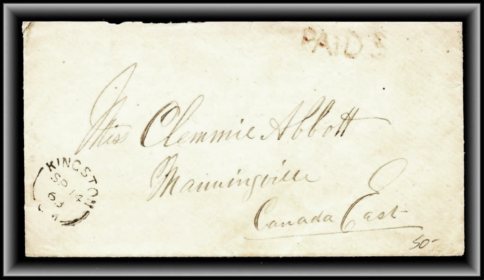 414 S o/CVR 1863 Stampless cvr, KINGSTON SP14/63 C.W., PAID 3 H/S in org.red, B/S Montreal,