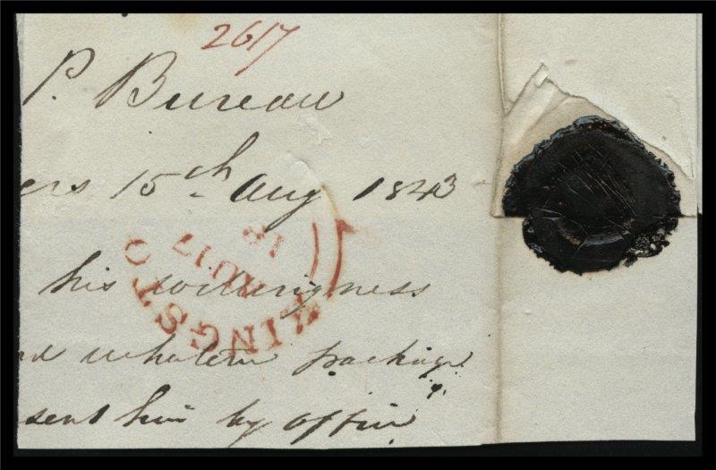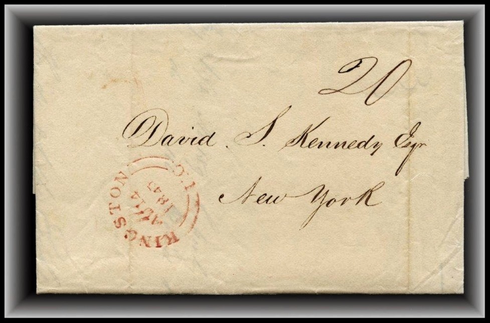 407 S o/CVR 1856 stampless letter KINGSTON FE26 1856 UC in red, PAID 3D in cir in red, PAID