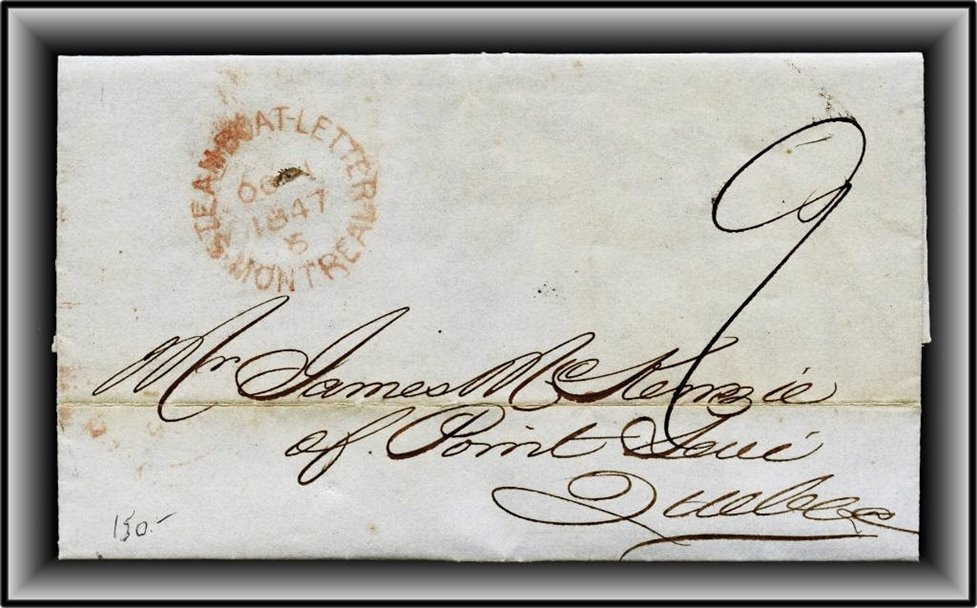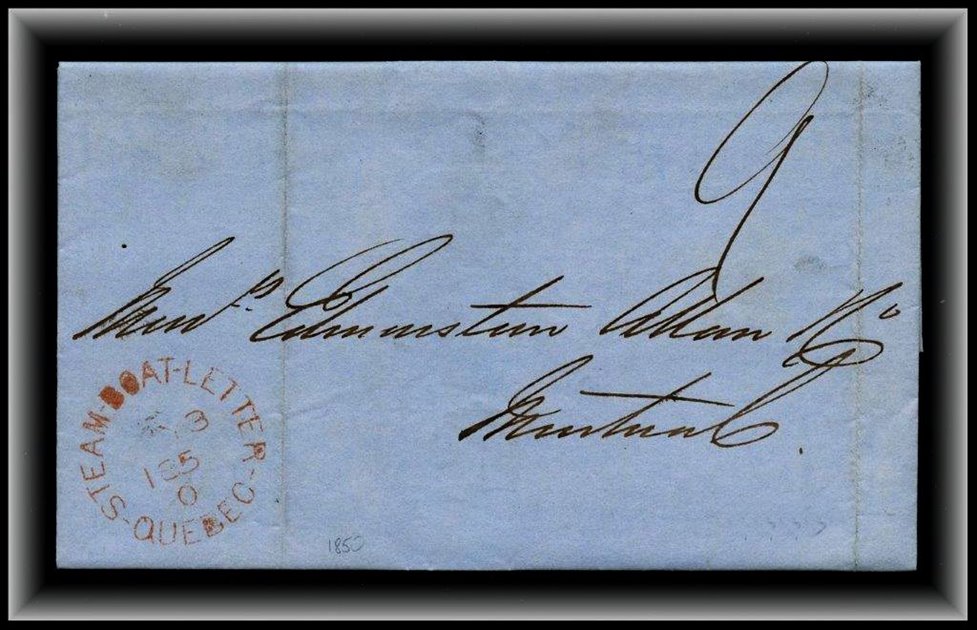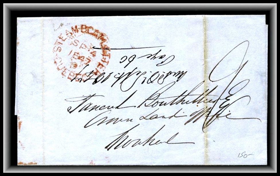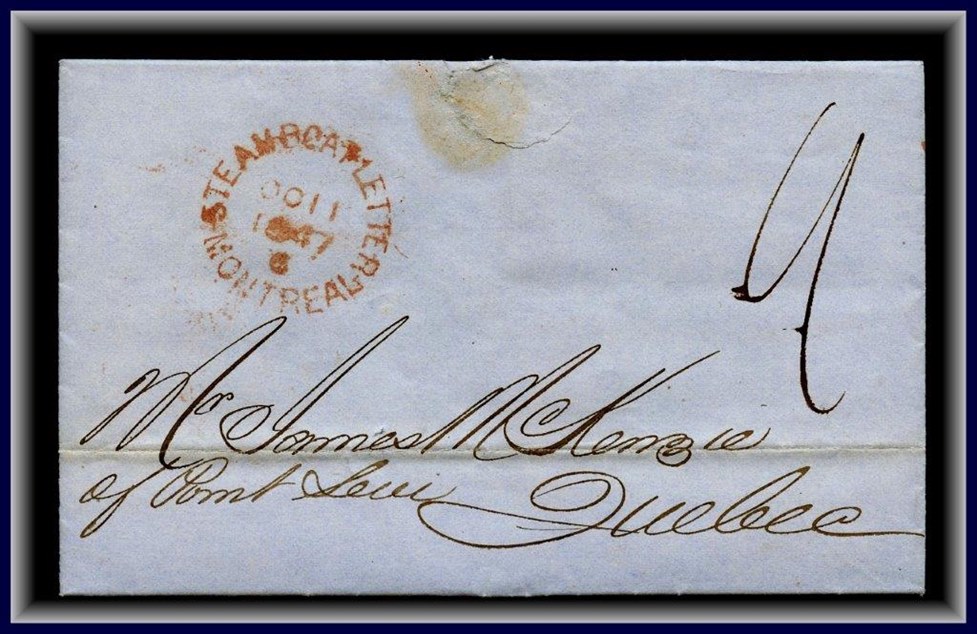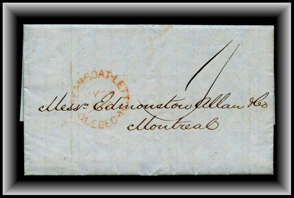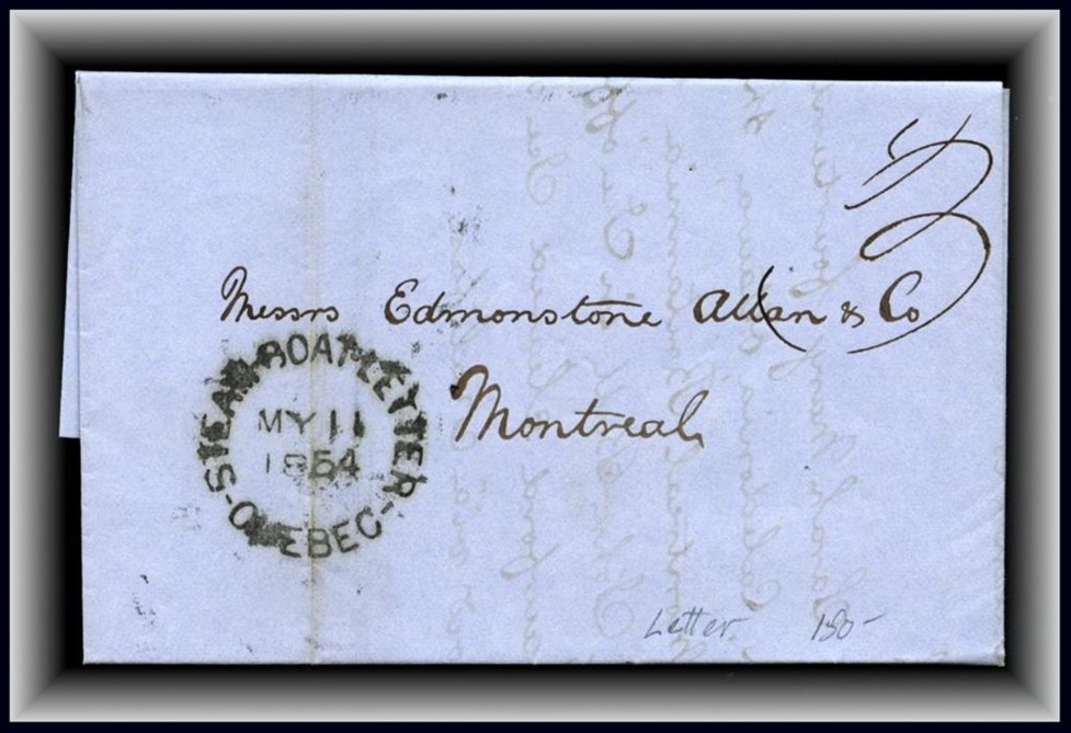 STEAMBOAT LETTER QUEBEC MY 11/1854 in black, B/S Montreal. VF