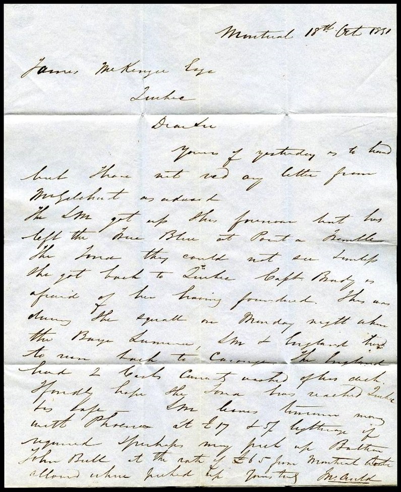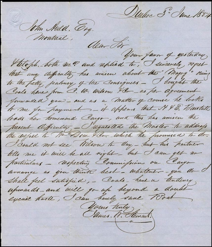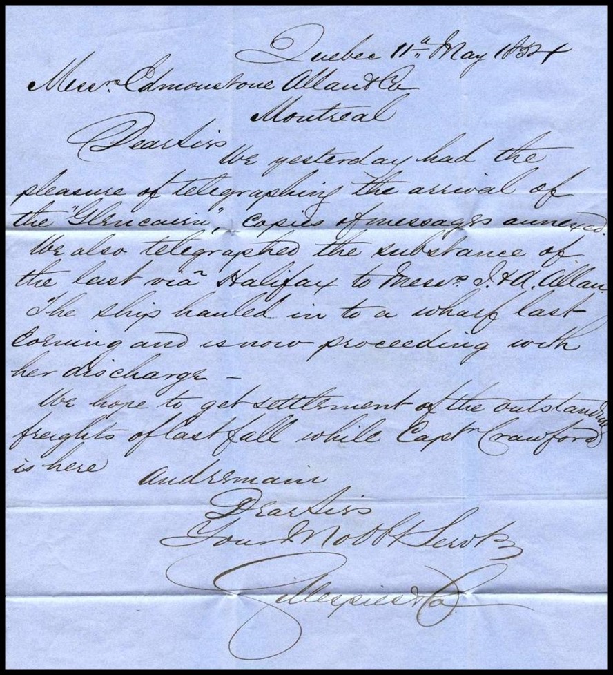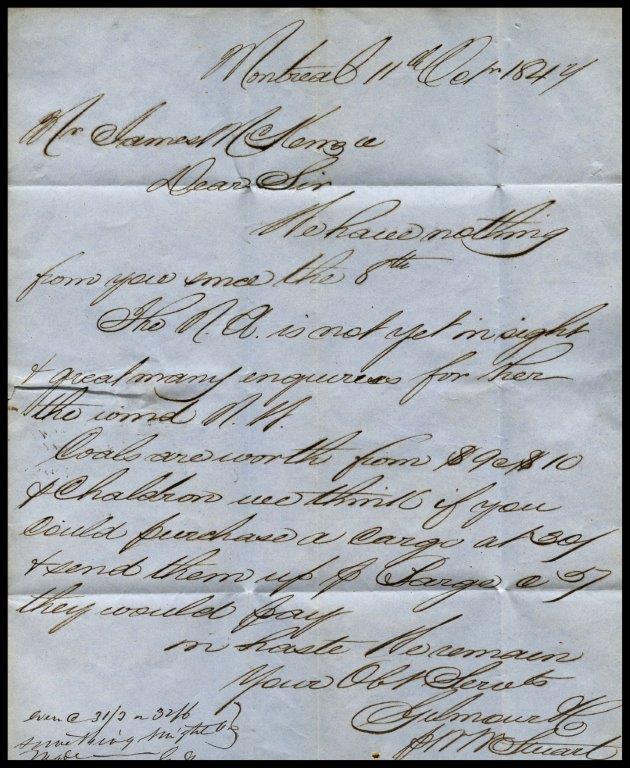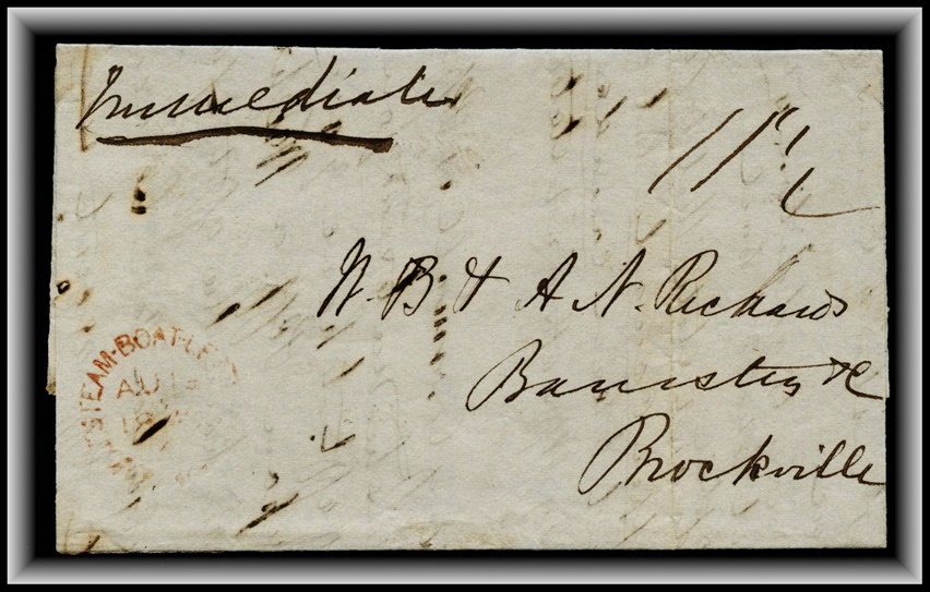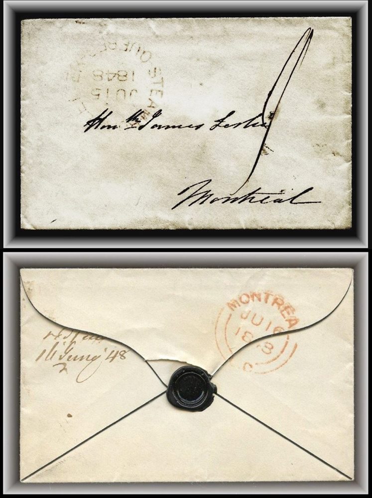 STEAMBOAT LETTER QUEBEC MY 11/1854 in black, B/S Montreal. VF