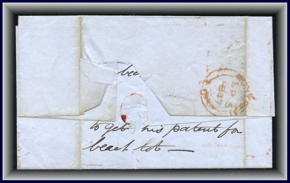 419 P o/CVR 1864 STAMPLESS CVR NEW IRELAND L.C dbl broken cir in red, manuscript 15 July/64
