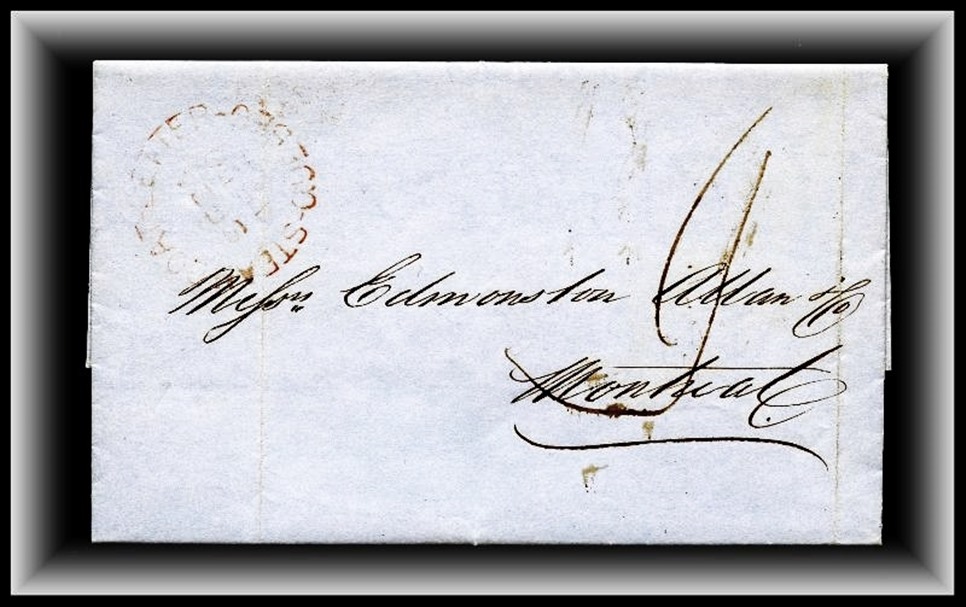 406 S o/CVR 1855 Stampless letter + enclosure, excellent red Tombstone "MONTREAL PAID