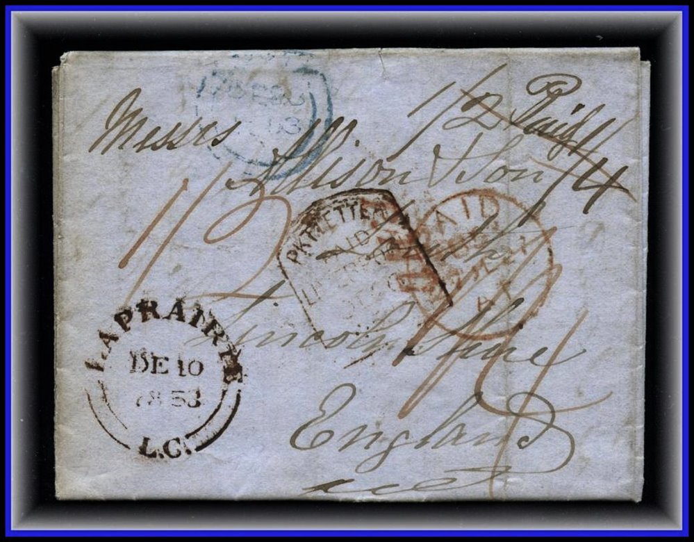 399 P o/CVR 1853 Stampless letter with long letter unread, LAPRAIRIE DE10/1853 L.C., red