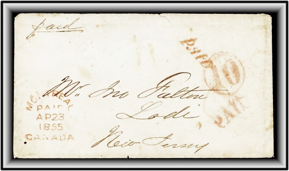404 S o/CVR 1855 Stampless Cvr.'MONTREAL PAID AP23 1855 CANADA' Tombstone,2 diff.'PAID',10