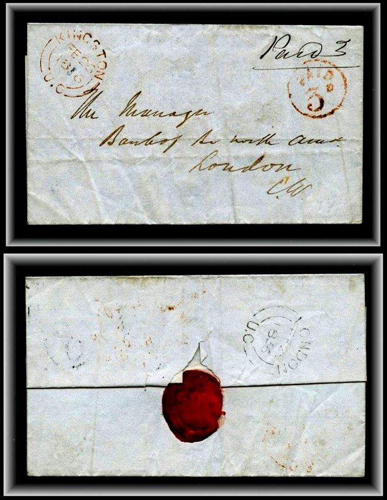 403 S oCVR 1855 Stampless, large 'PAID 3D' in circle in red, KINGSTON MR 12/1855 U.C.