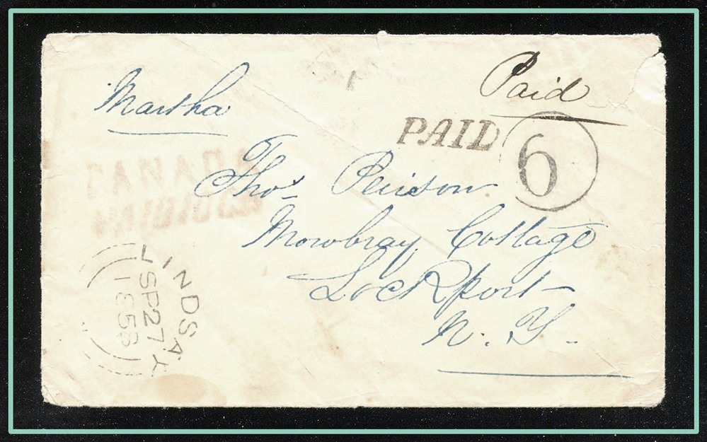 410 P o/CVR 1858 Stampless Cvr LINDSAY SP 27/1853 C.W,'CANADA PAID 10CTS' in red,PAID H/S in
