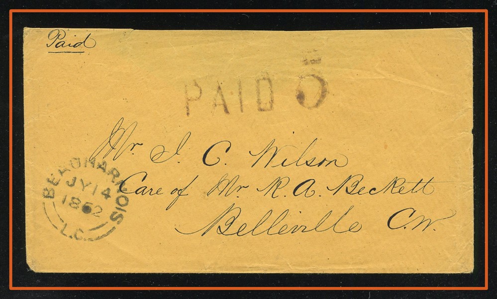 413 P o/CVR 1862 Stampless Cvr BEAUHARNOIS JY14 1862 'PAID 5' H/S in red B/S Belleville U.C.