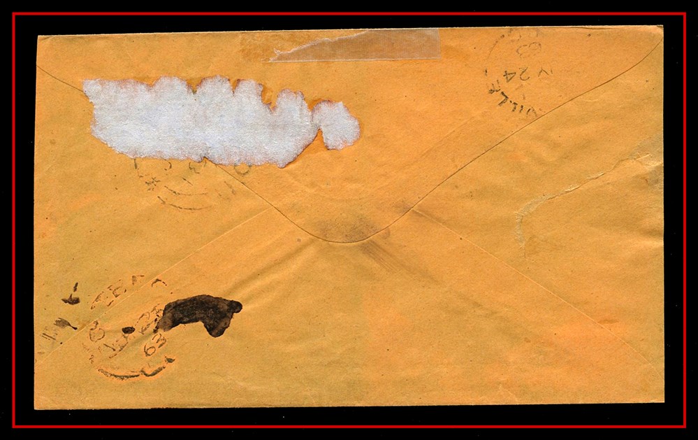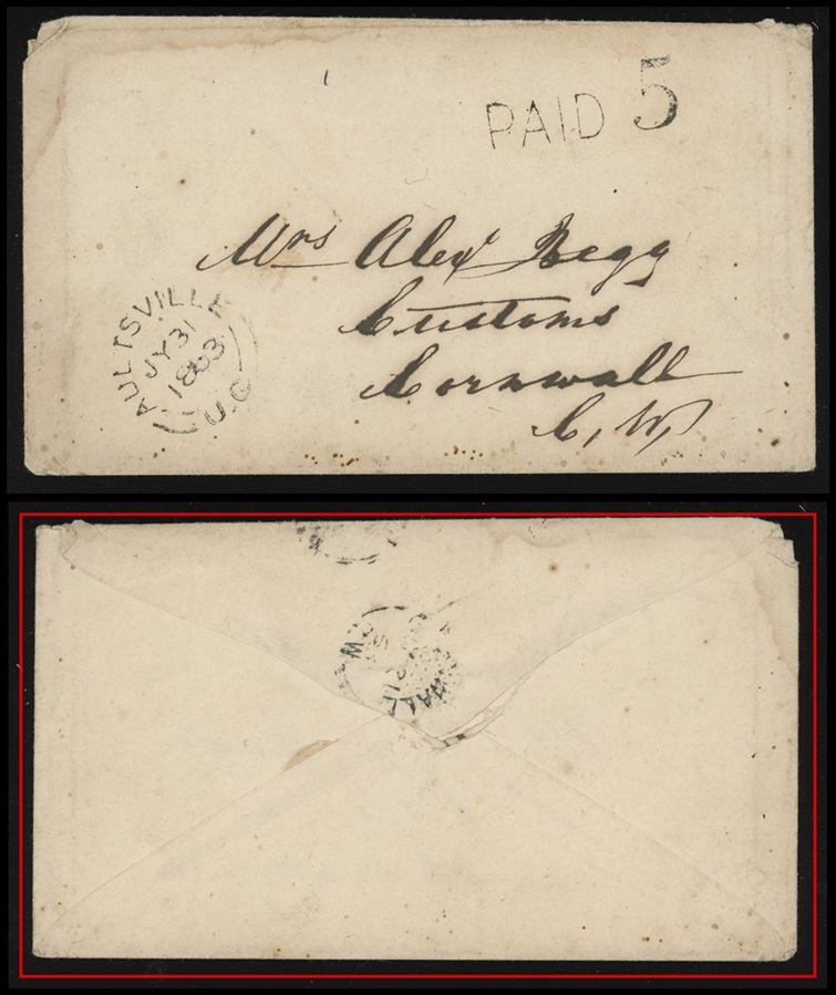 416 S o/CVR 1863 Stampless Cvr AULTSVILLE JY 31 1863 U.C broken double ring,'PAID 5' B/S