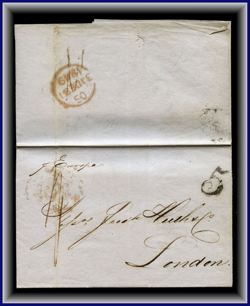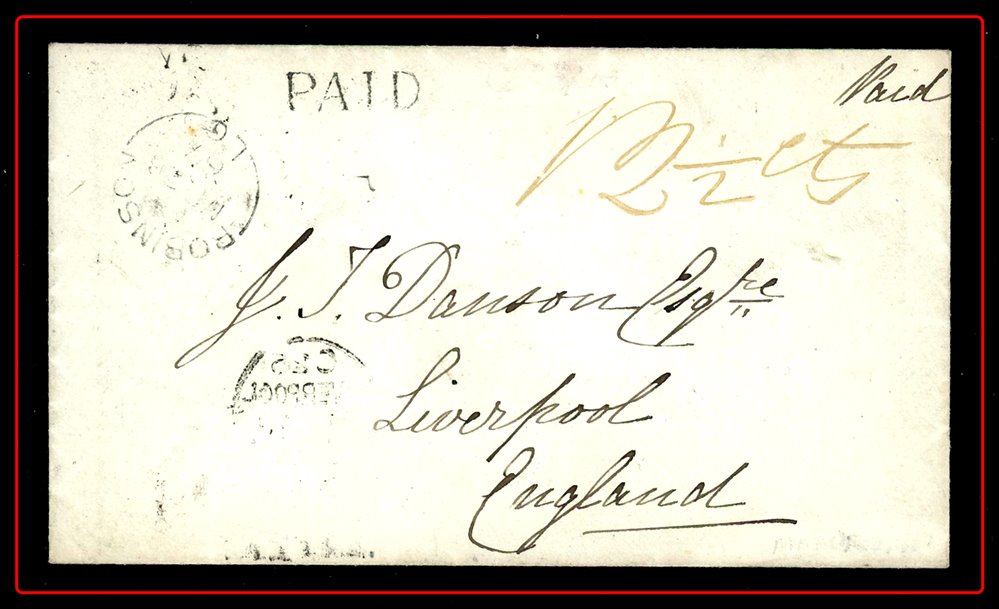PKT LETTER PAID LIVERPOOL DE26/53, LONDON PAID 1853 27 DE in red, rated 1s +4p
