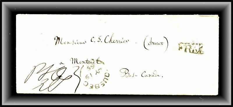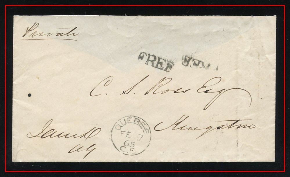 420 S o/cvr 1865 Stampless ladies env.rated FREE H/S, PJO (LEG.ASSEMBLY) QUEBEC JY 19/65 CE