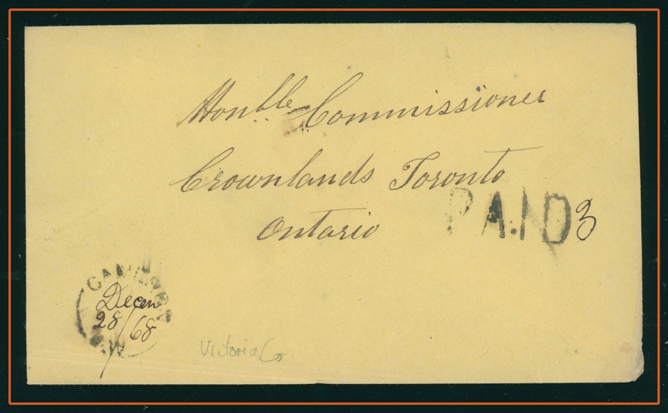 424 S oCVR 1868 Stampless HOUSE OF ASSEMBLY crown ONTARIO, CAMERON to TORONTO. CAMERON CW