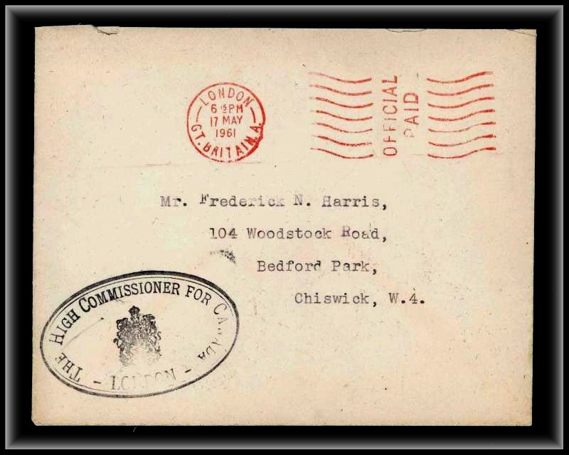 428 P o/CVR 1961 THE HIGH COMMISSIONER FOR CANADA LONDON (large oval cancel) LONDON OFFICIAL