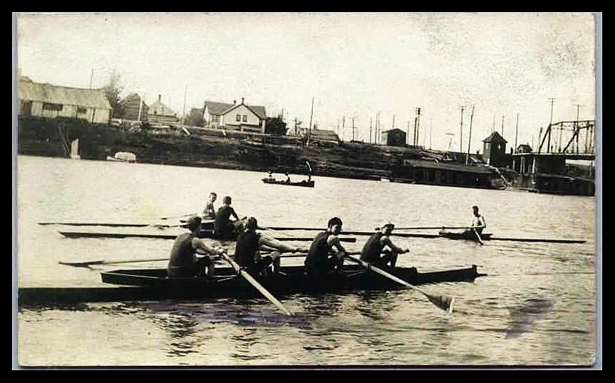 7 P PHOTO MONTREAL ROWING TEAMS ON RIVER smaller format 5 1/2" x 3 1/2", marked Mark