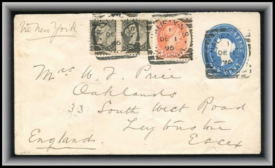 353 P o/CVR 34 PAIR + 41 + ONE CENT POSTAL STAT (5c rate to UK) HALIFAX 1/DEC 1 1896 SQ.Cir