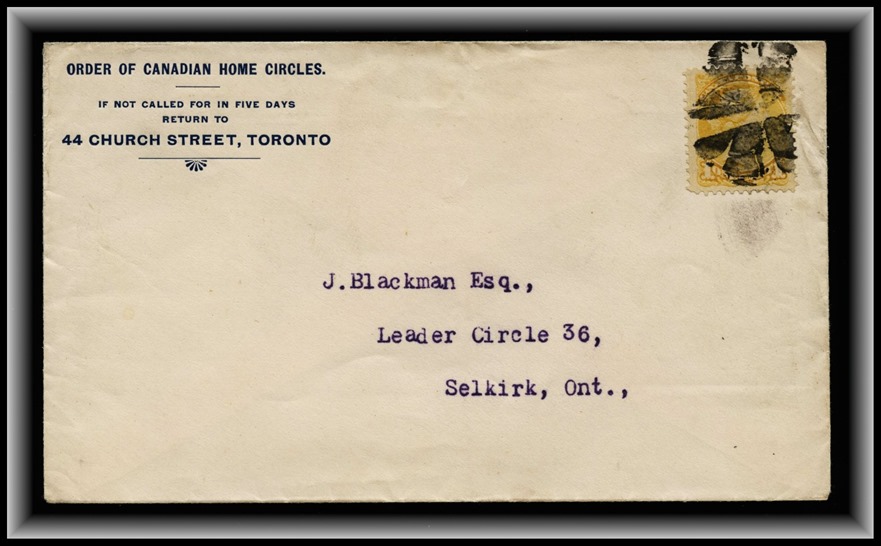 355 S oCVR 35 ORDER OF CANADIAN HOME CIRCLES(Toronto) corner card. Huge cross-cut segmented