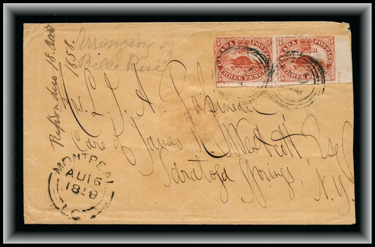 429 C o/CVR 4 Imprint Pair (paying the 6p rate to USA) MONTREAL AU16/1858 U.C. broken double
