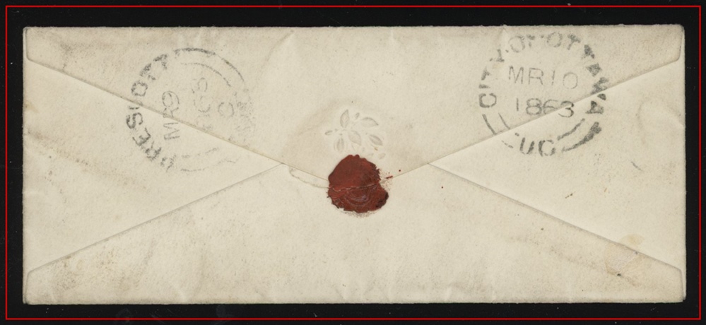 454 P o/CVR 15 ORMSTOWN L.C MR30/1863 broken double cir. B/S Montreal, Cesarea UC in carmine