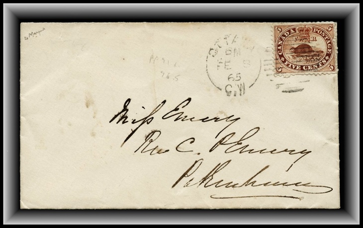 440 S o/CVR 15 OTTAWA PM FE 8/65 CW duplex. B/S PAKENHAM FE 9/1865 CW. F