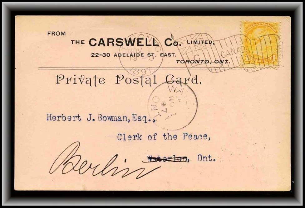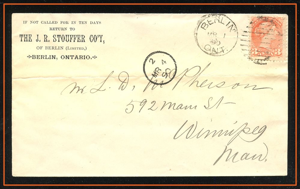 600 S o/CVR 41 The J.R STOUFFER CO'Y of Berlin, BERLIN MR 1/90 ONT duplex, B/S Winnipeg Man