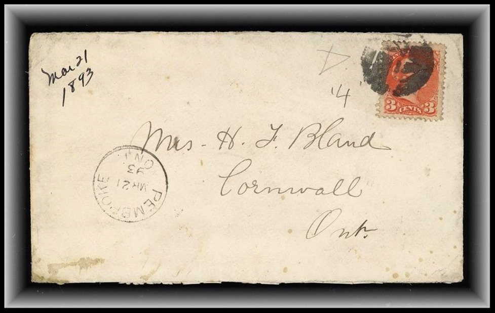 591 P o/CVR 41 fancy '4' PEMBROKE MR21/93 ONT B/S Cornwall to Mrs.Bland. Fine