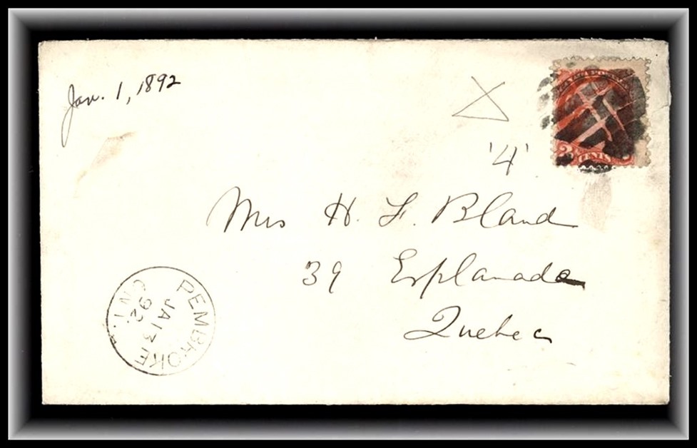 596 P o/CVR 41 PEMBROKE JA 13/92 ONT outstanding fancy '4' (Lacelle #76), B/S Quebec