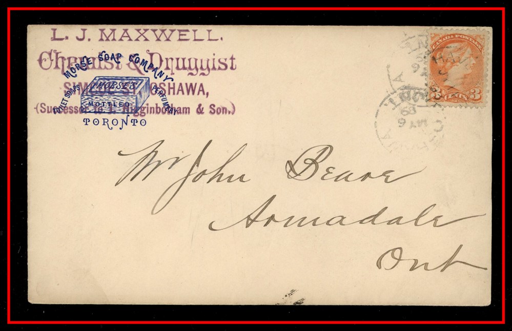 609 P o/PC 41 L.J.Maxwell Chemist & Druggist Simcoe St,Simcoe Ovpt on Morse Soap Co Toronto