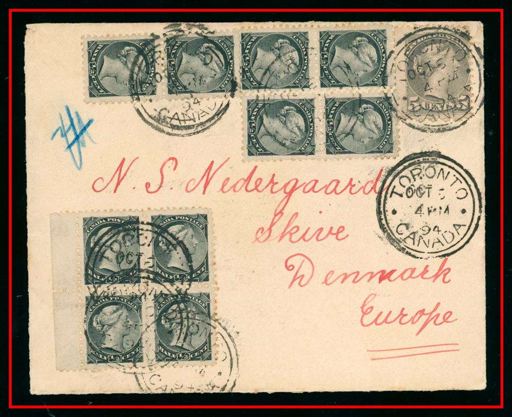 629 C o/CVR 42+34 2 blocks of 4 +vertical Pair, 10c rate to DENMARK, Toronto OCT 6/4PM/94