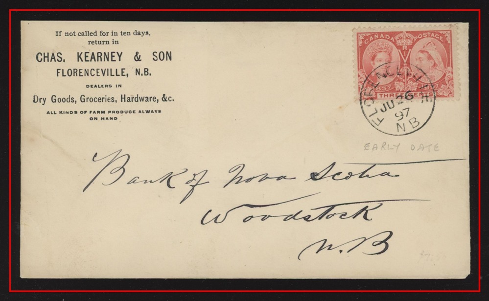 635 S o/CVR 53 Chas Kearny & Son Dry Goods Grocers crn card, FLORENCEVILLE JU 26/97 N.B CDS,