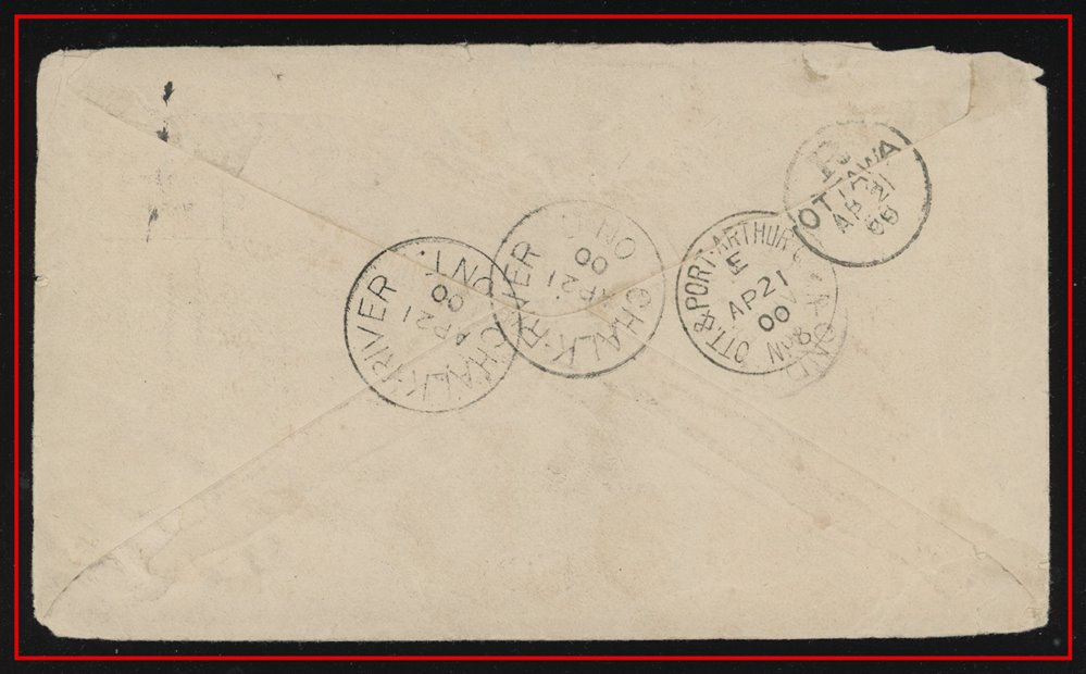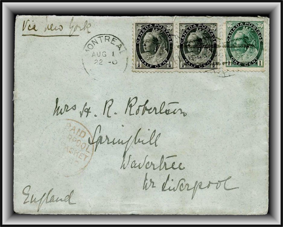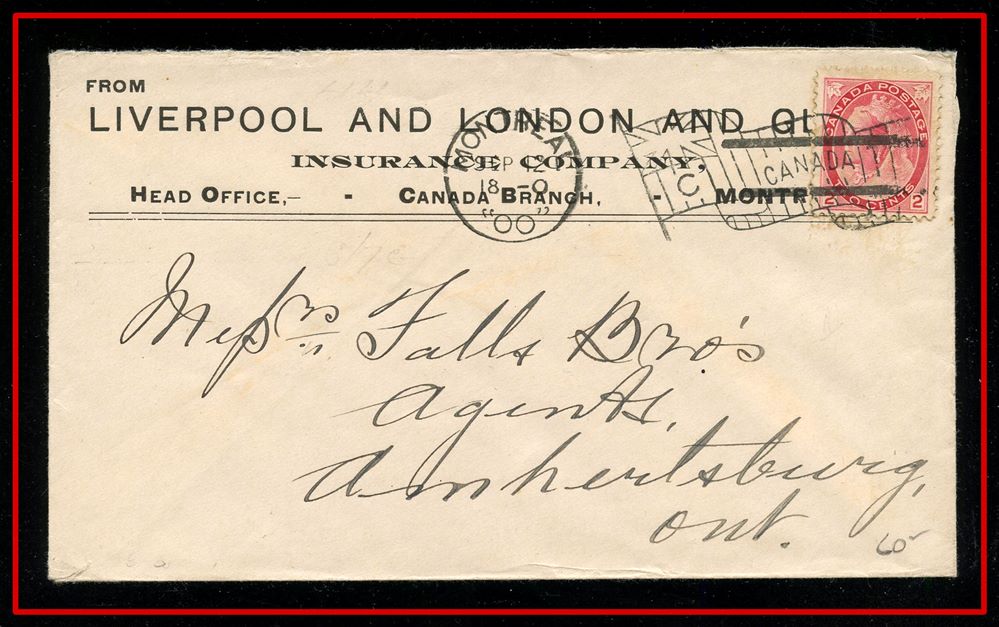 654 P o/CVR 74(pair)+75 MONTREAL AUG1/00 FLAG, PAID LIVERPOOL PACKET AUG/00 CDS in red.VF