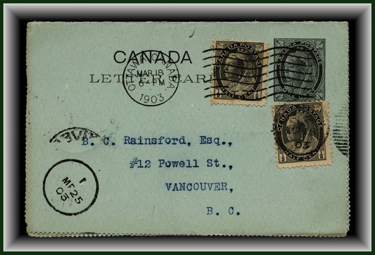 660 S o/PS 74(2)+1c Green Lettercard, OTTAWA MR18/03 machine canc B/S Vancouver BC (the