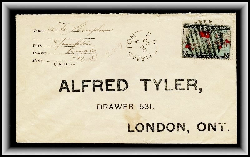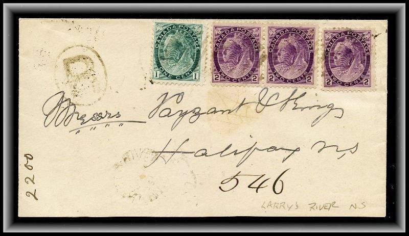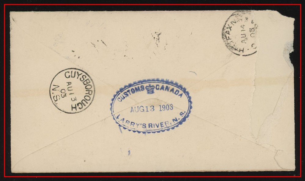 CUSTOMS CROWN CANADA AU 13 1903 LARRY'S RIVER N.S, Halifax arrival. F