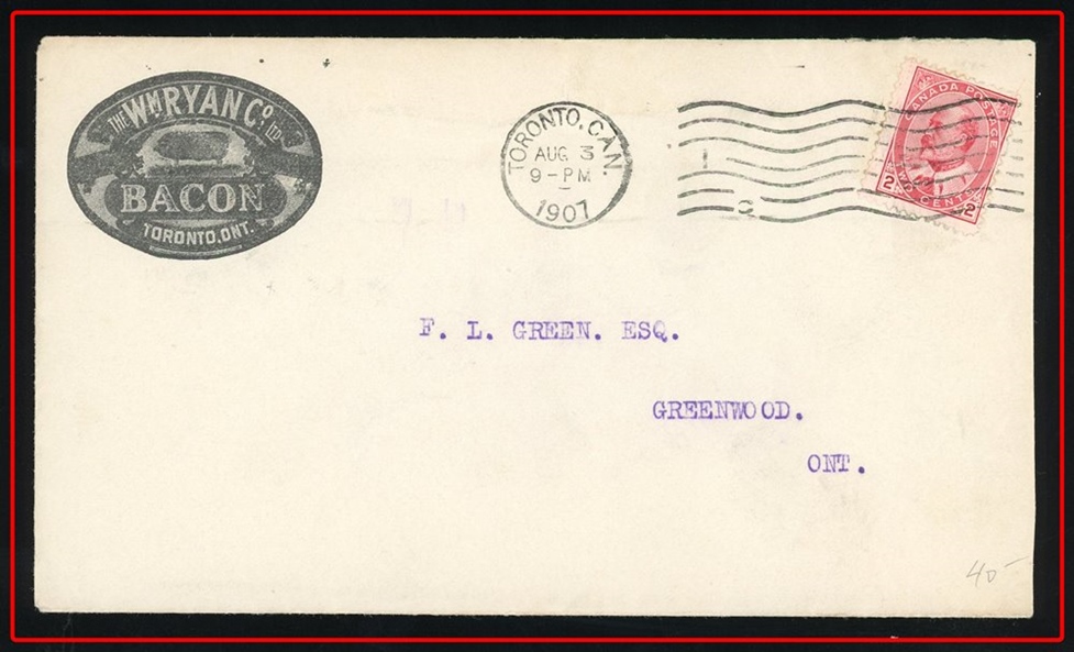 769 P o/CVR 90 THE WM.RYAN CO BACON (PIG ADVERT) TORONTO AU 13/07. B/S Whitby,Greenwood F-VF