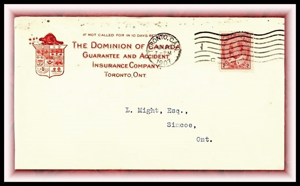775 P o/CVR 90 The Dominion of Canada Guarantee + Accident Ins. Co. Advert. in red, Toronto