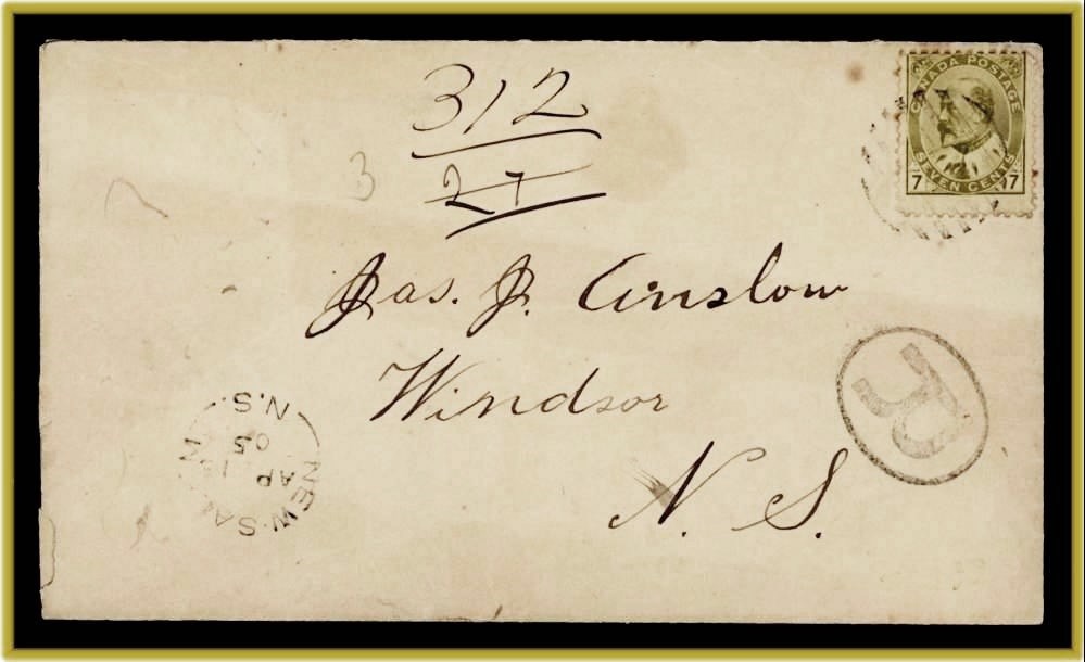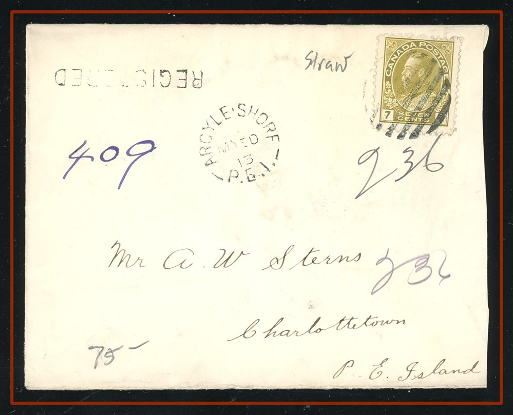 805 P o/CVR 113b (Deep Straw Shade) Scarce ARGYLE SHORE MY 30/13 PEI Spl cir,'Registered' H/S