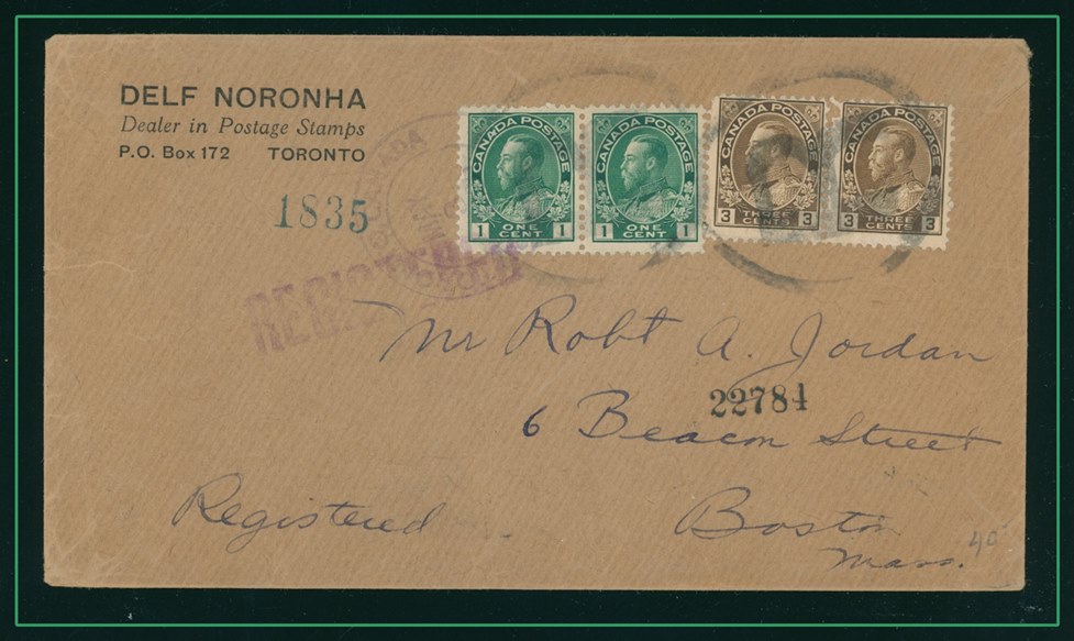 785 S o/CVR 104 Pr + 108 Pr D.NORONHA Dealer in Postage Stamps crn card, Lrg 'R', TORONTO