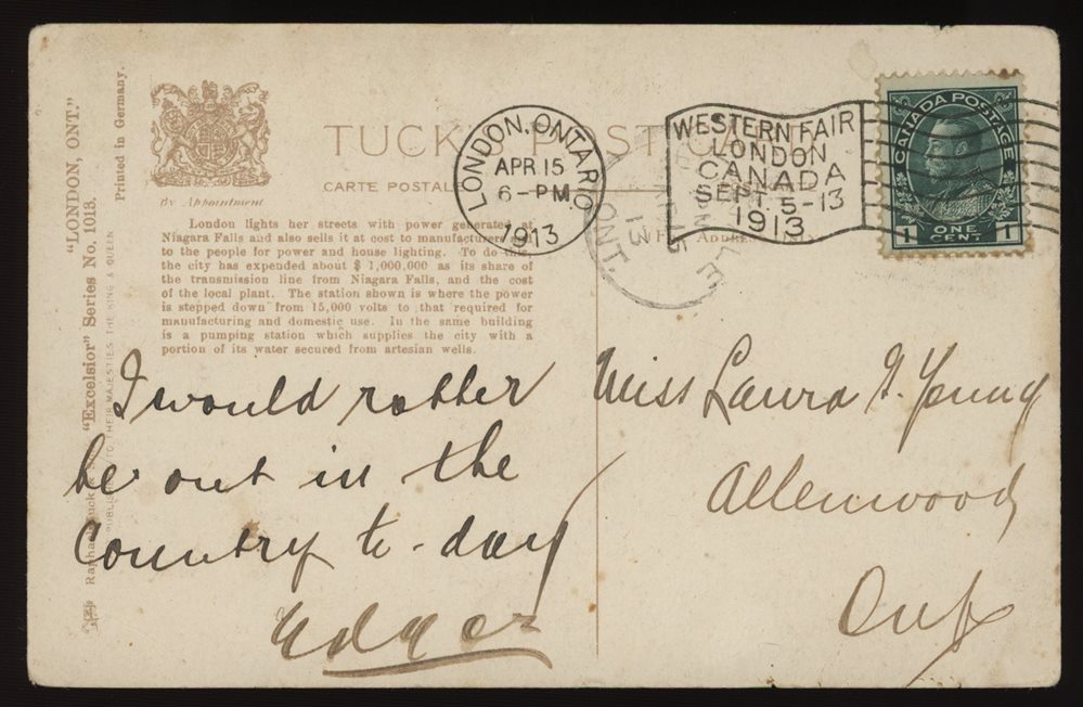 791 P o/PC 104b LONDON ONT WESTERN FAIR Flag APR 15/13 on Hydro Electric Stat London. VF