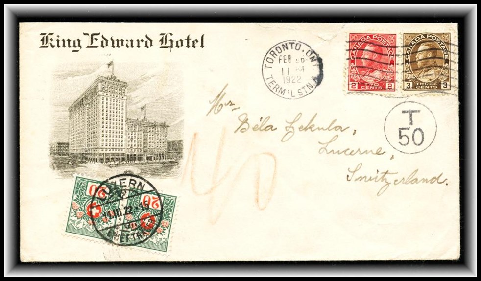 794 P oCVR SWITZERLAND - 106 + 108 on King Edward Hotel advert, TORONTO. ONT, TERMINAL STN.