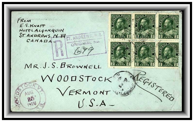 799 P o/CVR 107 (block of 6) with neat variety on ALGONQUIN HOTEL cvr, ST ANDREW'S box Reg.