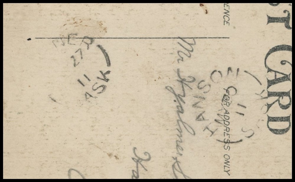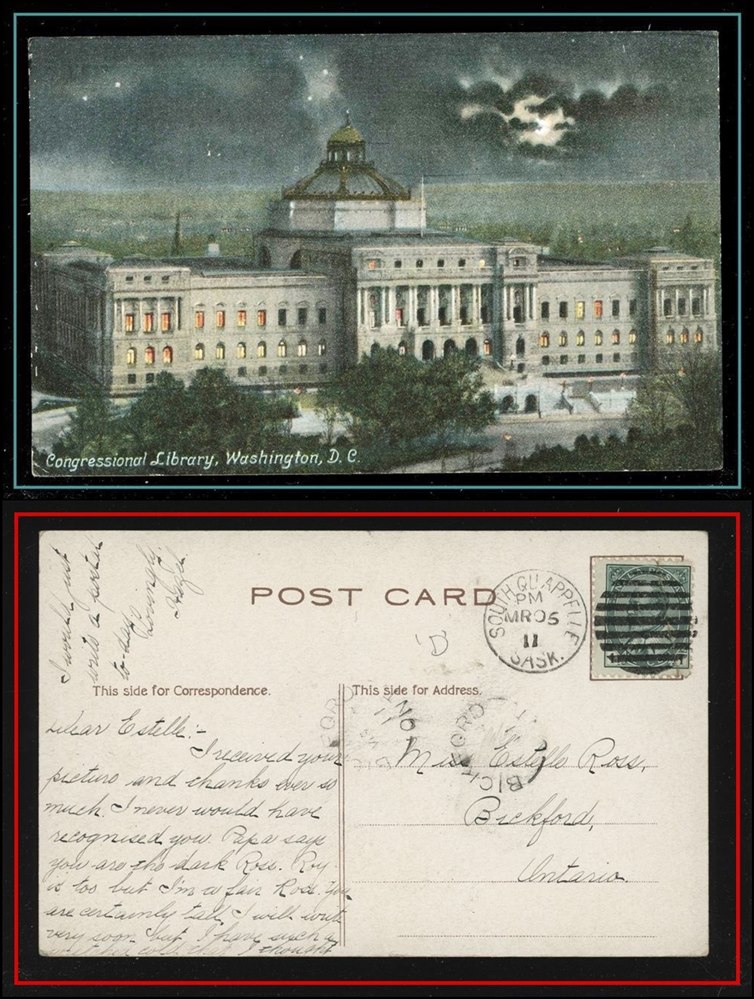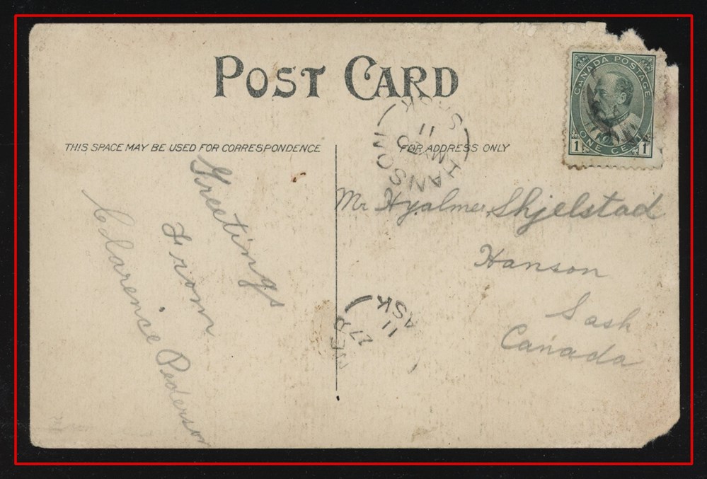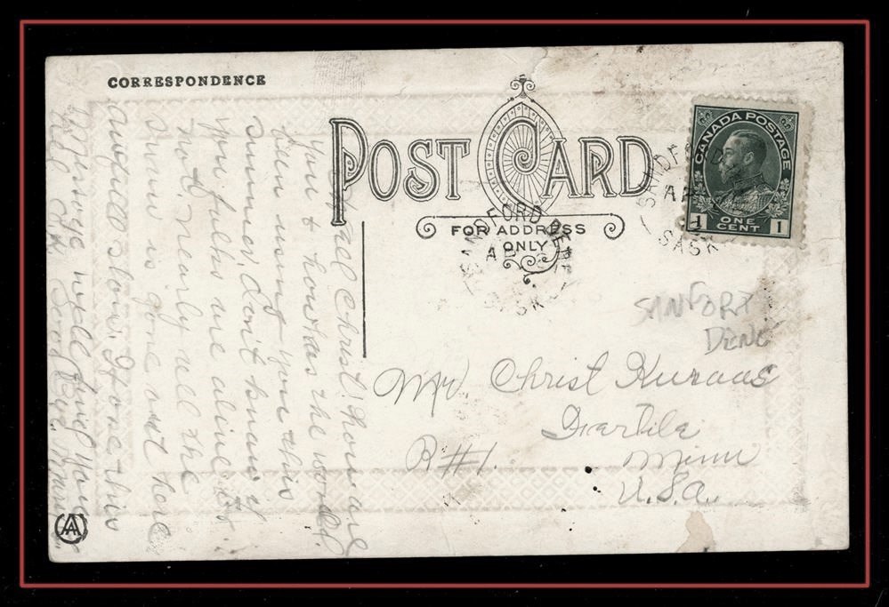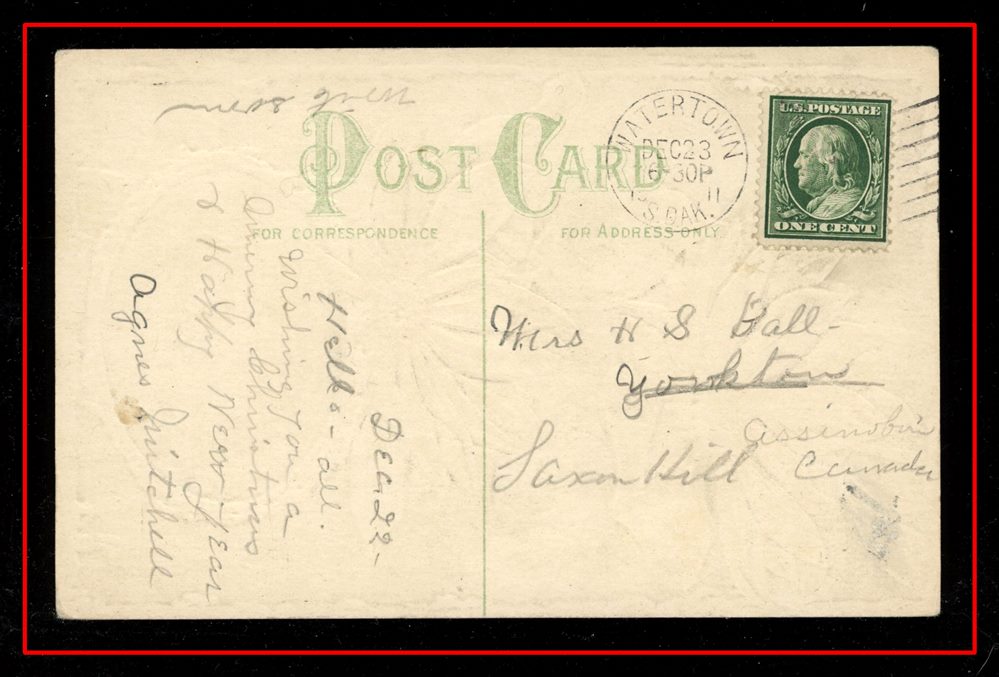 1191 P o/PC 1911 USA Watertown De23/11 S.D.,B/S SAXON HILL DE29/11 SASK split circle. VF