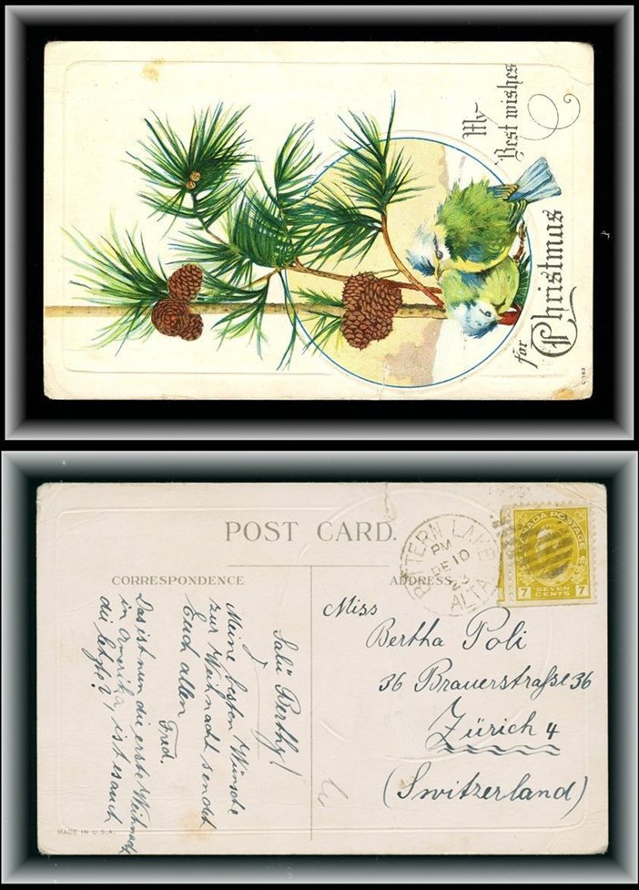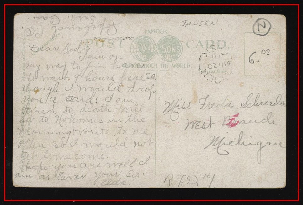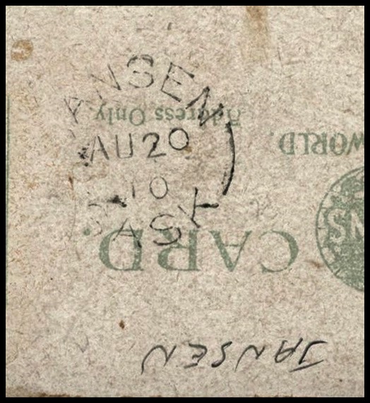1184 S o/PC 1910 JANSEN AU 20/10 SASK Spl.cir on Saskatoon Sask PC to USA (no stamp appears