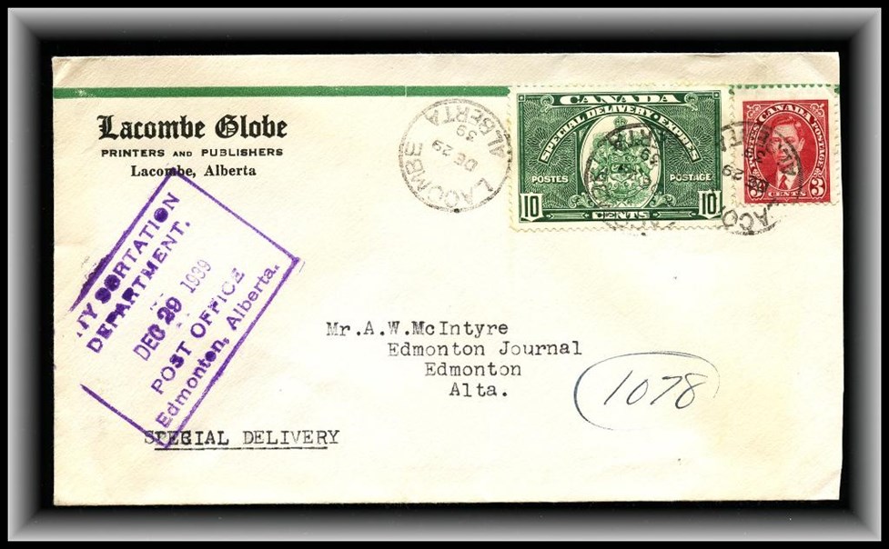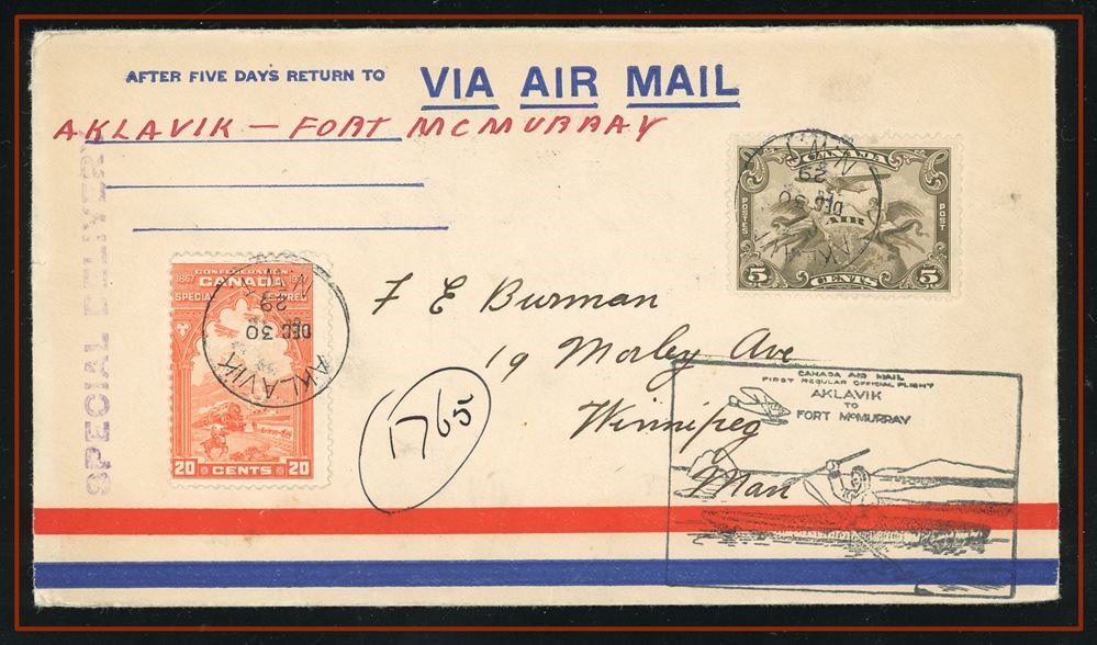 1319 P o/CVR E3 + C1 SPECIAL DELIVERY CVR AKLAVIK N.W.T. DEC 30/29 B/S Edmonton, Winnipeg.