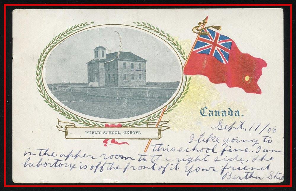 1167 P o/PC 1908 OXBOW PUBLIC SCHOOL PATRIOTIC PC Flag in colour, Oxbow SP 18/08 Sask to