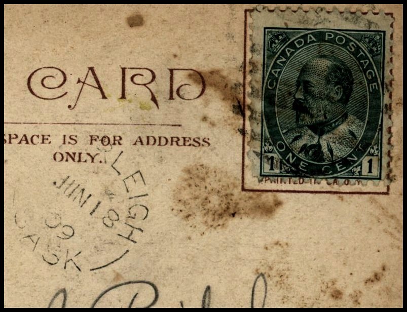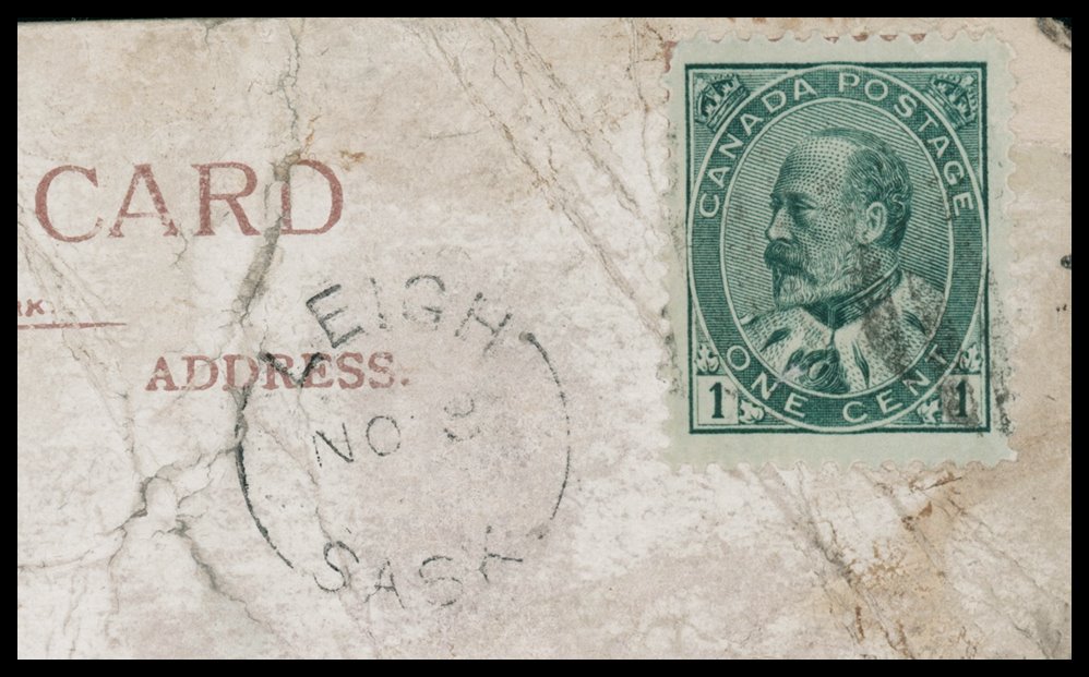 1190 P o/PC 89 LEIGH NO9/11 SASK split cir. RFE Rare. VF strike, on PC with faults