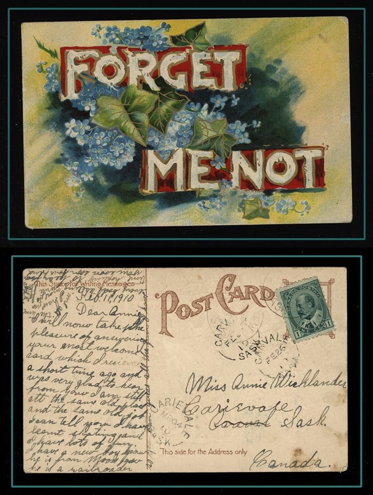 1182 P o/PC 89 very rare Sask cancs on 'Forget Me Not' PC, CARVALE FE26/10 SASK split circle