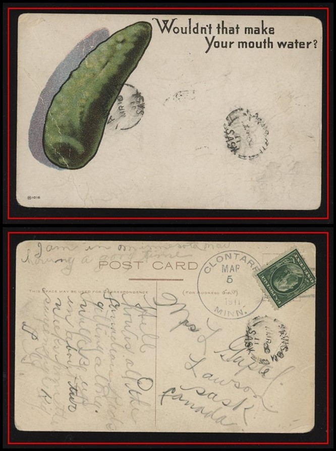 1192 S oCVR 1911 USA to Lawson Sask, LONDON MR 10/11 SASK Spl.cir (2 strikes) on Pickle card.