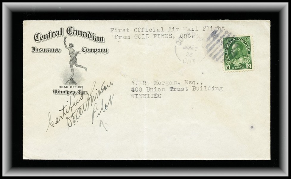 MAIL FLIGHT Gold Pines JAN 28/28 Ont Duplex to Wpg. Pilot signed D.Atkinson
