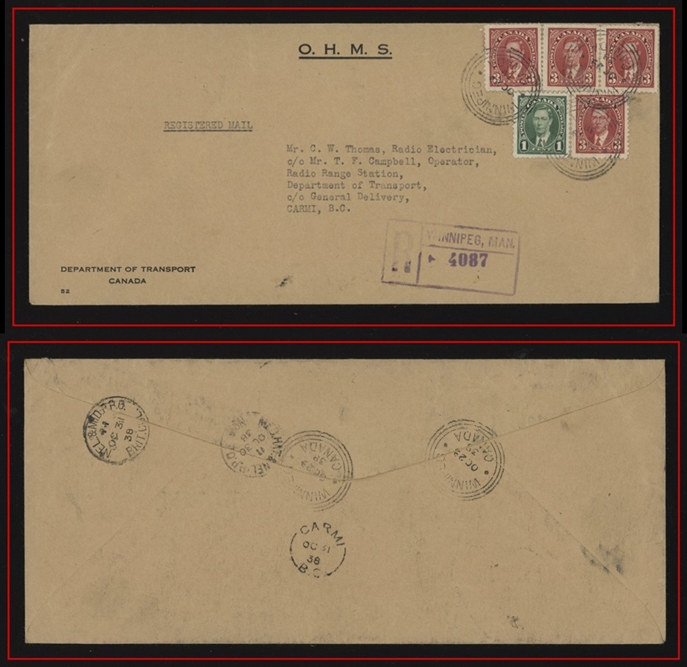 1296 S o/CVR 231,233(4) OHMS cover Dept.of Transport, WINNIPEG orb Oc29/38, B/S same,RPO, NEL